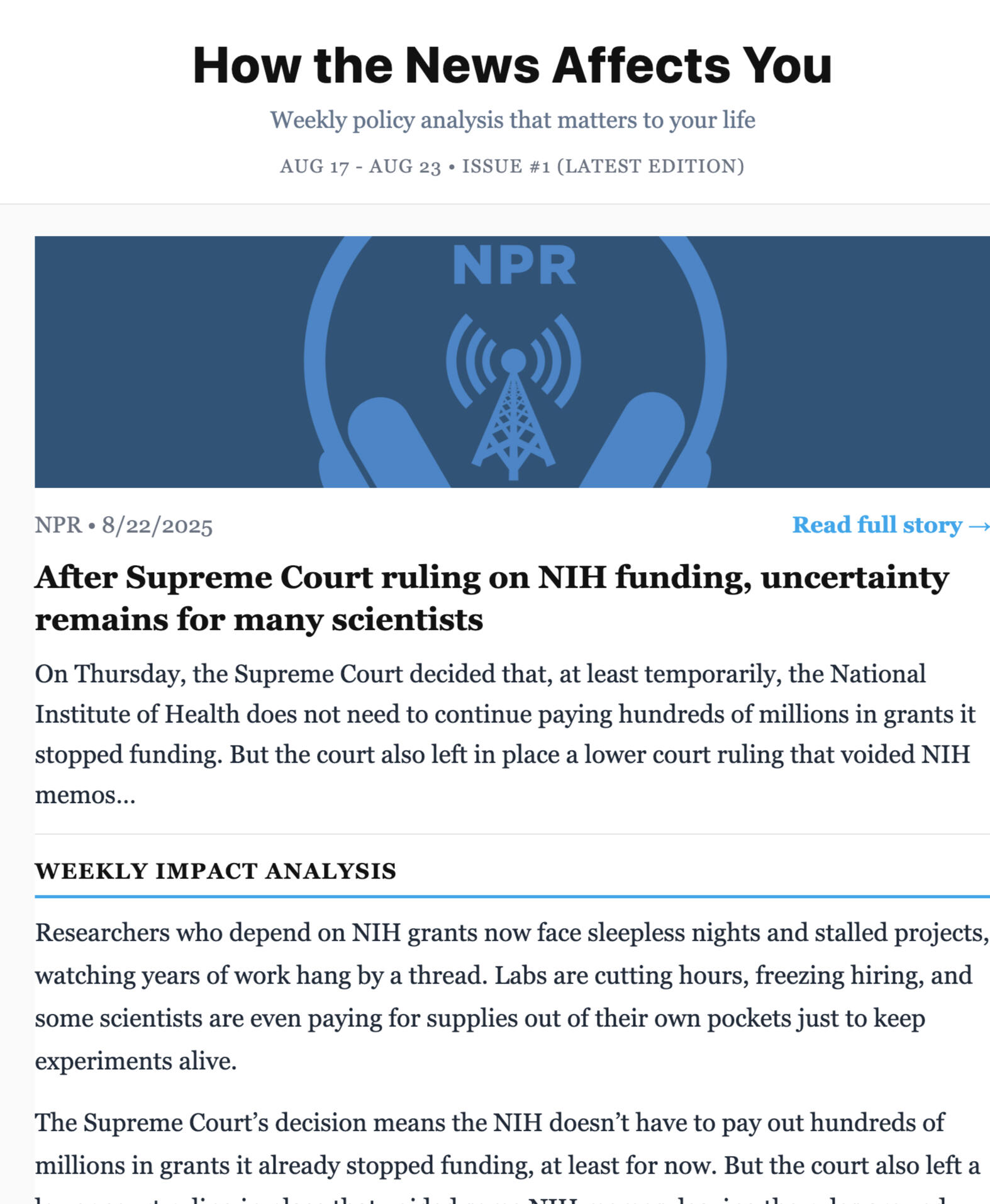 A smart news tool that explains how current events directly impact your life, in plain language.