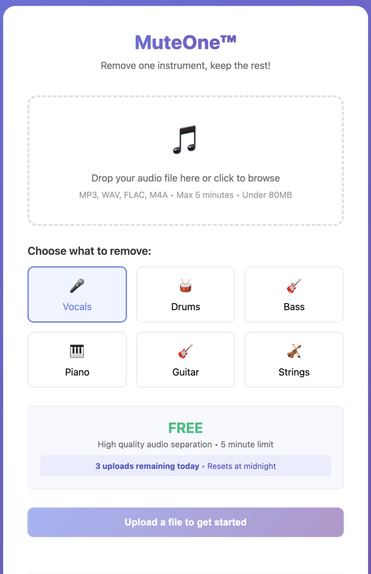 MuteOne - An ultra-fast vocal remover that instantly mutes vocals from any song, creating perfect karaoke tracks and instrumentals so you can sing like a star or remix like a pro.