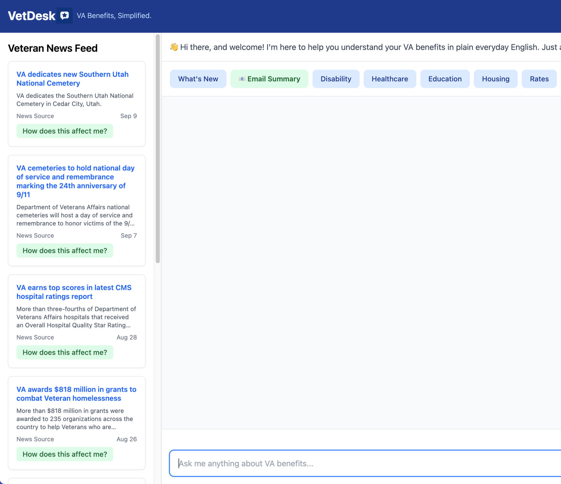 An AI-powered assistant that helps veterans navigate VA benefits, claims, and news in simple everyday language.